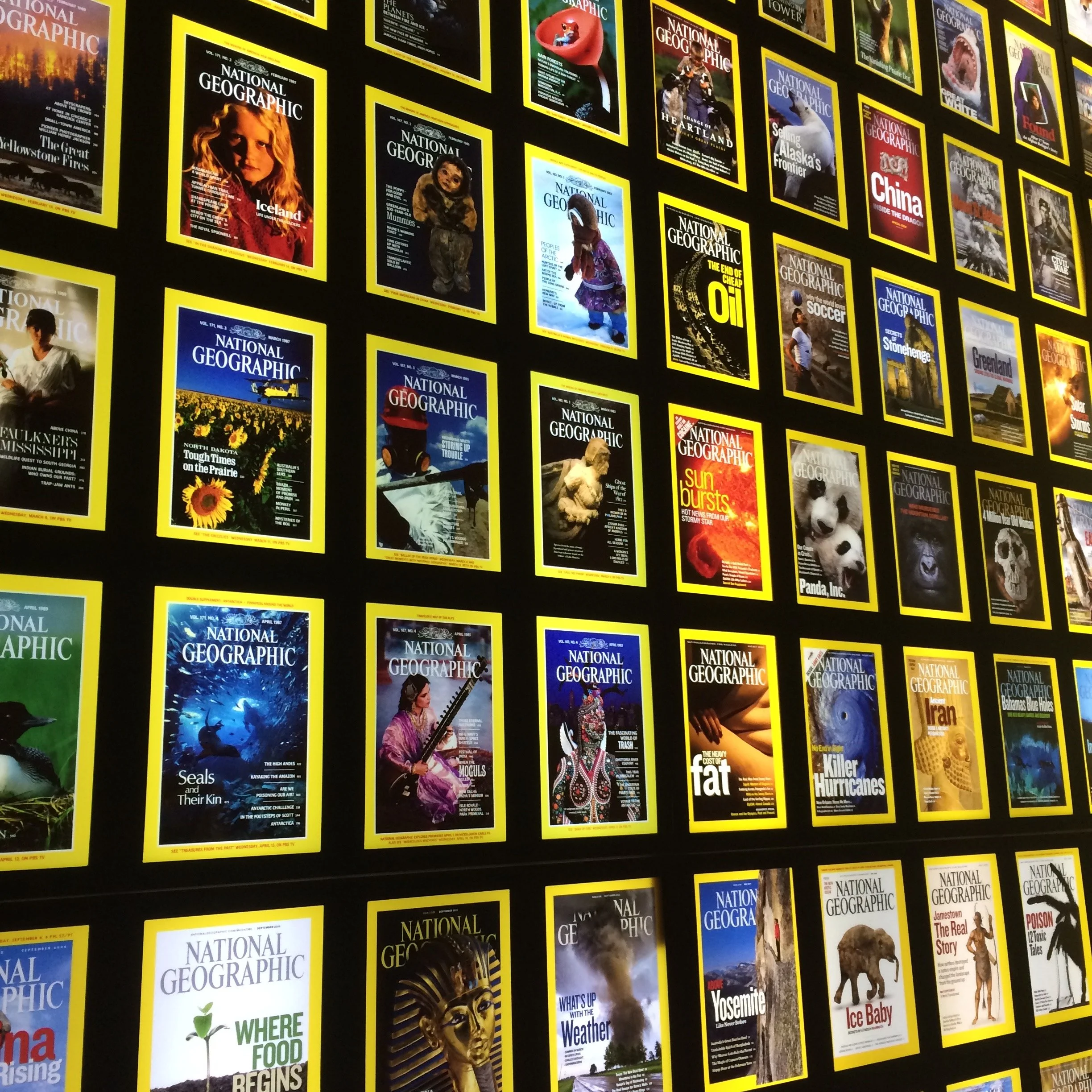 Lit wall of the years of iconic Nat Geo magazine covers