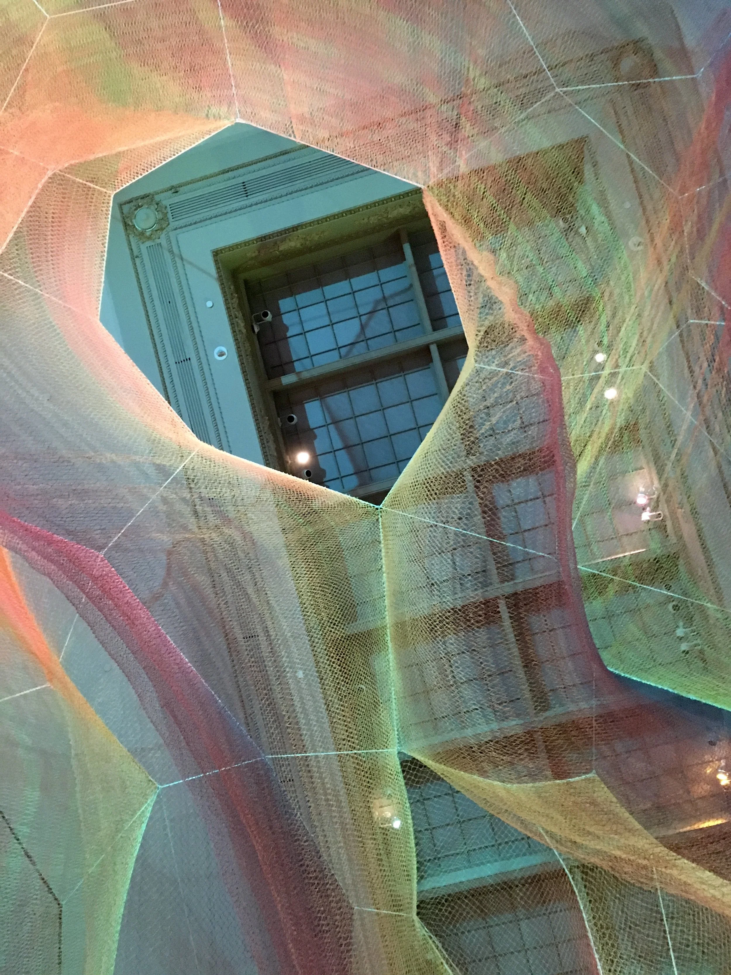 Janet Echelman’s light and fiber installation is a net of overhead expanse that plays with humans and the physical world