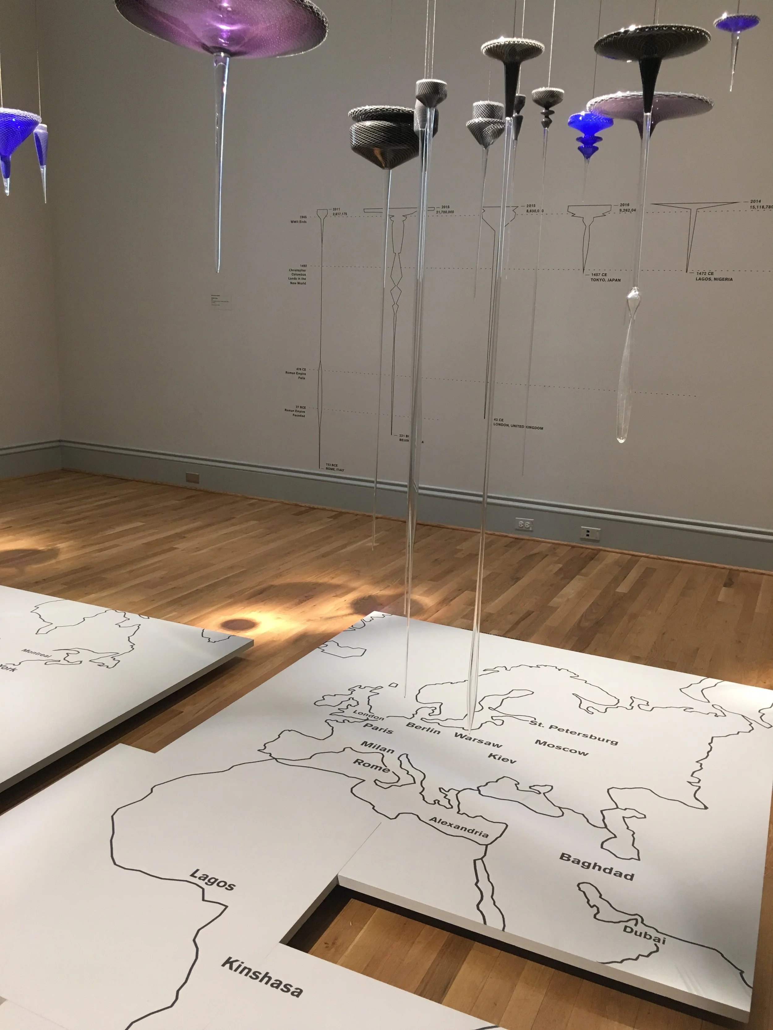 Norwood Viviano Global Cities glass installation showing population differentiation in 30 cities
